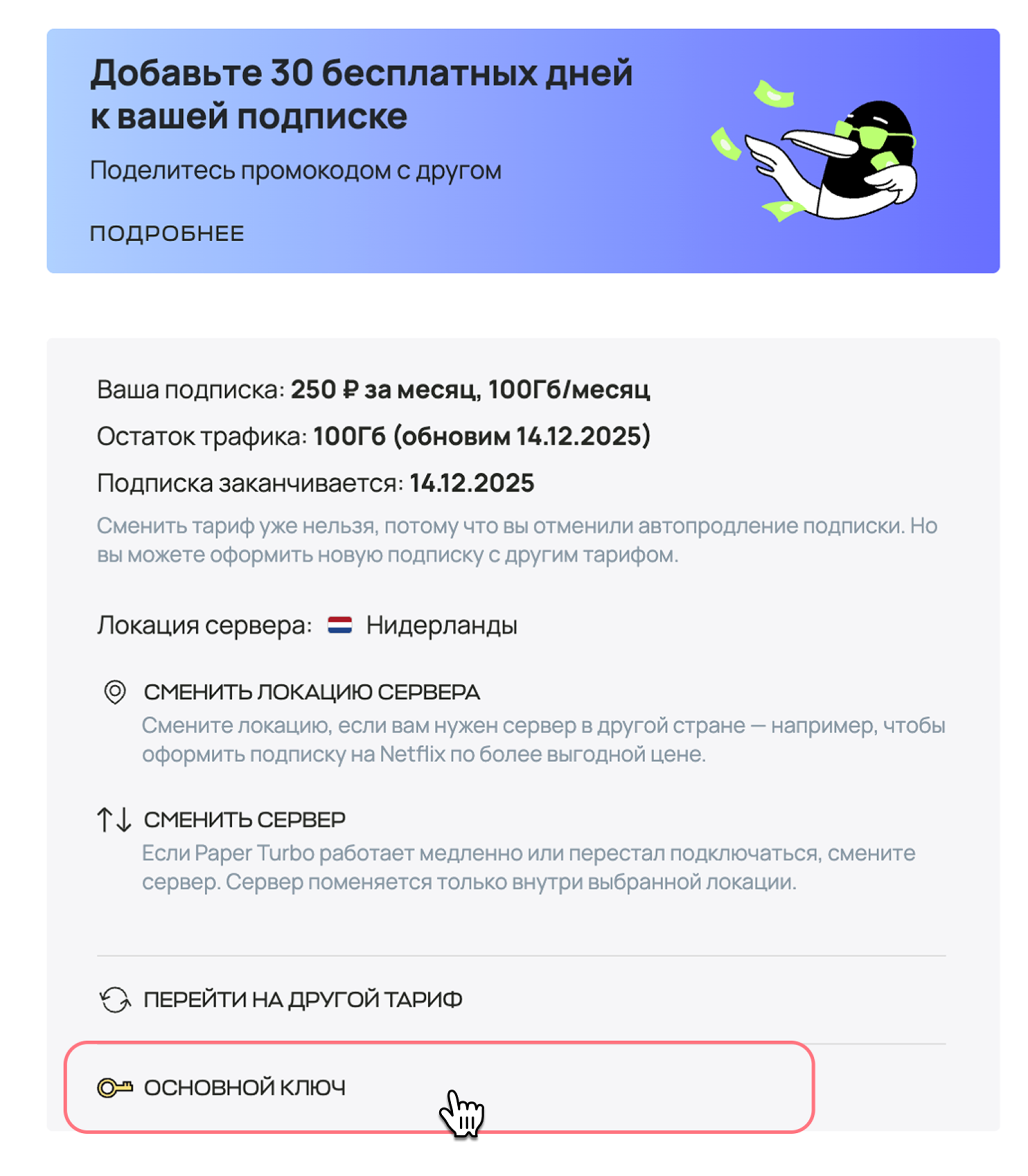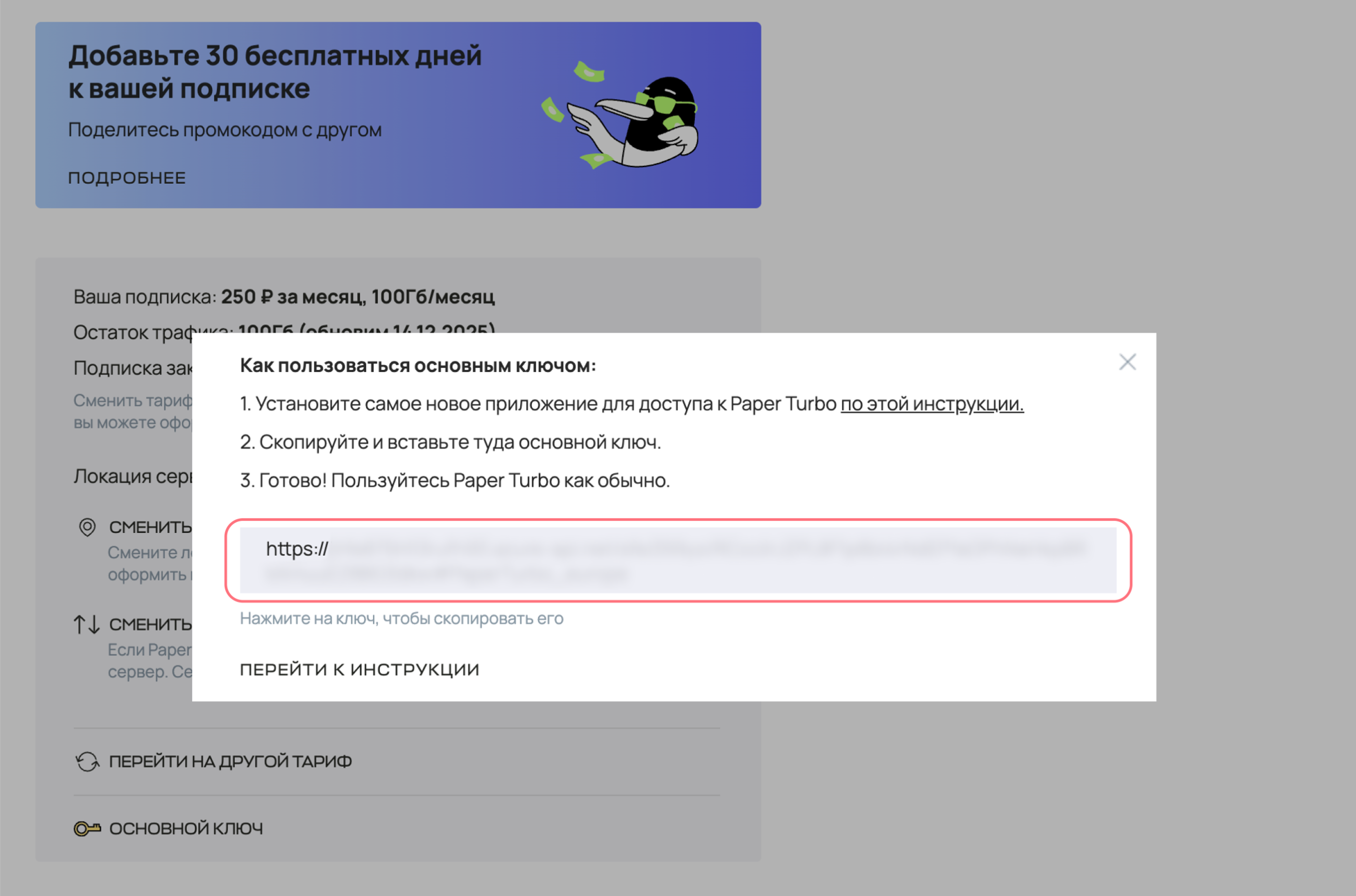 После установки программы найдите ваш ключ доступа в личном кабинете. Для этого откройте раздел «Подписки» и нажмите «Основной ключ». Ключ начинается на https://. Кликните по ключу — он скопируется в буфер обмена.