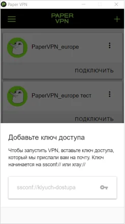 После установки программы найдите ваш ключ доступа в личном кабинете. Для этого откройте раздел «Подписки» и нажмите «Основной ключ». Ключ начинается на https://. Кликните по ключу — он скопируется в буфер обмена.